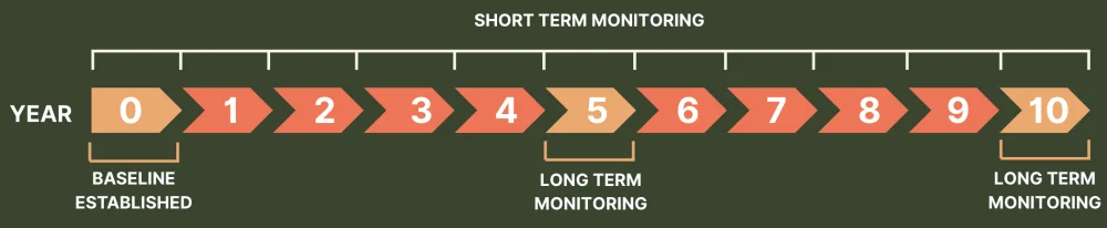 Your first monitoring is your Baseline Year (or Year 0) where we set up Short Term and Long Term sites, including soil testing and water infiltration measurements. We GPS them so you won't have stakes etc in your paddock. Short term sites are monitored annually, long term every 5 years.